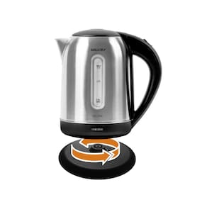 Chaleira elétrica Mallory Selene 1,7L em inox com desligamento automático, filtro removível, visor de nível de água e luz indicadora de funcionamento.Características