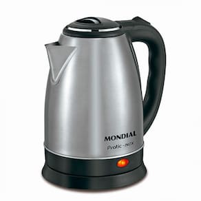 Chaleira Elétrica prática e com acabamento em aço inox, aquece e prepara de forma rápida e silenciosa cafés, chás, chimarrão, sopas, macarrão e outros alimentos, além de esterilizar as louças.