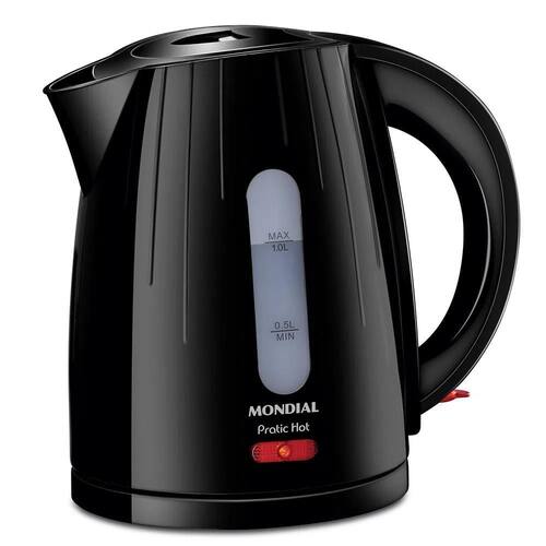 Chaleira Elétrica Mondial Pratic Hot 1 L Preta 220V - CE-07A Chaleira elétrica CE-07 tem capacidade de 1 Litro e jarra removível, que vai à mesa.Basta um toque para ligá-la para iniciar a fervura e, ao ferver, ela desliga sozinha.Livre de BPA, ela tem ainda indicador de nível de água.Esta chaleira elétrica aquece e prepara de forma rápida e silenciosa cafés, chás, chimarrão, sopas, macarrão e outros alimentos, podendo até esterilizar louças.Ela desliga automaticamente quando atinge a temperatura ideal de fervura, proporcionando mais segurança e economia de energia para você.Com o botão para abertura da tampa fica mais fácil de enchê-la e o indicador de nível transparente permite aquecer a quantidade exata de água que você precisa.Uma lâmpada indica quando ela está funcionando.A base gira 360 e tem porta-fio, o que dá mais praticidade para ligar e para guardar.Ela foi desenvolvida para uso doméstico, sendo melhor para uso residencial.Especificações Técnicas:Marca: MondialLinha: Pratic HotModelo: CE-07Capacidade: 1 LitroTensão: 220V Não é Bivolt Potência: 1200WMaterial: PolipropilenoDesligamento: AutomaticoIndicador de Nível de ÁguaLivre de BPAComprimento do Cabo: 80 cmGuarda-fio: SimTipo de tomada: 10AGarantia de Fabrica: 12 MesesItens inclusos:01 Chaleira - 01 Manual de InstruçõesMedidas AxLxP : 17 x 18 x 13 cmPeso: 0,67 kg