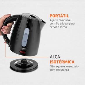 Chaleira Elétrica Mondial Pratic Hot com capacidade de 1 litro, potência de 1350W, desligamento automático, alça isotérmica, porta-fio e lâmpada piloto.Vendido e entregue por Outlet das Fabricas