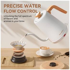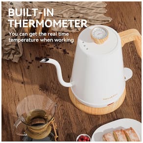 A Chaleira Elétrica Nueve&Five Gooseneck é equipada com termômetro embutido que mostra a temperatura da água conforme ela aquece, ideal para preparar bebidas que requerem temperaturas específicas. Seu design exclusivo permite um fluxo de água preciso e potente, perfeito para um café coado. Com 1000W de potência, ferve 1 litro de água em apenas 5 minutos. Possui desligamento automático para segurança, proteção contra fervura seca e desligamento automático. Feita de aço inoxidável de grau alimentício, fácil de limpar e segura de usar. Perfeita para proporcionar um bom café ou chá a qualquer momento.