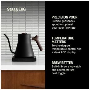 CHALEIRA ELÉTRICA STAGG EKG: A estética simples encontra o design poderoso. Uma chaleira tipo pescoço de ganso que serve tão bem quanto parece. É feito em aço inoxidável 304 de qualidade com base minimalista para economizar espaço e capacidade de 0,9 litro. POUR DE PRECISÃO: O bico pontiagudo e elegante do Stagg EKG foi projetado para um fluxo poderoso, mas preciso, para a taxa de fluxo ideal, e a alça contrabalançada fornece uma aderência robusta, incentivando um vazamento mais lento. A TEMPERATURA IMPORTA: Acelere seu processo de fabricação de cerveja com Stagg EKG e seu elemento de aquecimento rápido de 1200 watts para ferver água. O controle de temperatura em graus torna o aperfeiçoamento de sua xícara de café manual ou chá infundido de maneira contínua e precisa. FAÇA COMO UM PRO: Uma tela LCD elegante indica a temperatura definida desejada e a temperatura em tempo real para seu café ou chá. Use o Brew Stopwatch integrado para cronometrar a extração e ative o botão para manter a água quente por até 60 minutos. FELLOW: Combinamos um belo design com funcionalidade impecável para ajudar todos a preparar um café melhor.