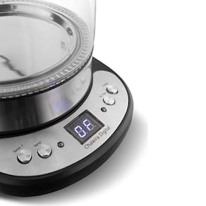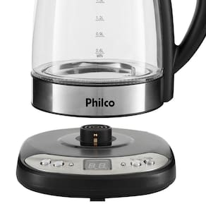 Chaleira Elétrica Philco Digital Glass com capacidade de 1,7 litros, controle eletrônico de temperatura (50 a 95°C), desligamento automático com bip sonoro, base destacável com porta-cordão e jarra de vidro com indicador de nível de água.Características