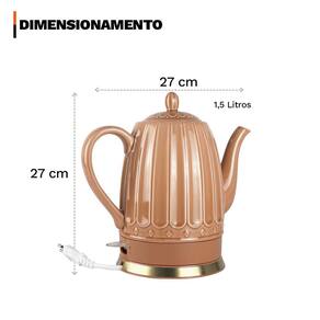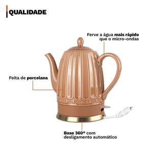 Distribuído por feheros shop Chaleira elétrica porcelana elegance salmão 1,5l base 360 desligamento automático Atenção Esta chaleira elétrica é feita em porcelana, material mais delicado e sofisticado que o inox ou o plástico. Portanto, embora elegante, requer mais cuidado durante o manuseio. Nunca utilize diretamente no fogão ou forno. Produto exclusivo para uso com a base elétrica que acompanha. A chaleira possui desligamento automático ao atingir o ponto de fervura, evitando superaquecimento, mas deve ser sempre Utilizado com água no interior, respeitando o nível mínimo e máximo indicado. Evite quedas, choques térmicos ou batidas. - leia atentamente a descrição e siga o passo a passo que o fabricante recomenda. Informações do produto A chaleira elétrica porcelana elegance salmão vai transformar sua rotina com elegância e eficiência com design clássico e acabamento em porcelana na sofisticada cor salmão, ela une praticidade, charme e segurança para aquecer água de forma rápida. Ideal para quem aprecia bebidas quentes com estilo, como chás, cafés e infusões, ou precisa de água quente com agilidade no dia a dia. A capacidade de 1,5 litros é perfeita para atender toda a família. Conta com base giratória 360, desligamento automático e proteção contra superaquecimento, tornando seu uso seguro e cômodo. É uma peça que além de funcional, valoriza a decoração da sua cozinha. Especificações técnicas - capacidade de 1,5l, ideal para preparo de bebidas ou uso culinário no dia a dia - fabricada em porcelana de alta qualidade, resistente ao calor e com acabamento brilhante e elegante - bico antigotejamento, que evita derramamentos e facilita o uso com mais segurança - base giratória 360 removível, proporcionando mais praticidade para destros e canhotos - desligamento automático ao atingir a fervura da água, evitando riscos de superaquecimento - botão liga/desliga com luz indicadora de funcionamento - design decorativo em porcelana salmão, elegante e funcional - mais eficiente que o micro-ondas e mais segura que as chaleiras de fogão Ficha técnica do produto - capacidade: 1,5 litros - altura com base: 27 cm - largura: 27 cm com alça - diâmetro da base: 16,5 cm - peso: 0,950 kg - material da chaleira: porcelana - material da base: polipropileno com componentes elétricos - frequência: 60 hz - cabo: 80 cm - cor: salmão - desligamento automático - base giratória 360 Antes e depois do primeiro uso - antes de utilizar, verifique se a voltagem da chaleira é compatível com sua tomada. para a primeira utilização, ferva água uma vez e descarte o conteúdo, eliminando possíveis resíduos de fábrica. Se necessário, repita o processo. - após o uso, aguarde a chaleira esfriar totalmente antes de lavar. Faça a limpeza com esponja macia e sabão neutro. evite molhar a base elétrica ou utilizar produtos abrasivos. Itens inclusos no pacote - 01 chaleira elétrica de porcelana elegance salmão 1,5 litros - 01 base elétrica com rotação 360 - 01 manual de instruções Todas as fotos são reais dos produtos. Qualquer dúvida, estamos à sua disposição Dúvidas frequentes 01 - a chaleira é 100% de porcelana R: sim. O corpo da chaleira é feito inteiramente em porcelana de alta qualidade, com visual refinado. 02 - pode ser Utilizado no fogão ou micro-ondas R: não. O uso deve ser feito exclusivamente com a base elétrica que acompanha o produto. Não utilize em fogo direto, forno ou micro-ondas. 04 - como acompanhar o envio do produto R: após a postagem, você poderá acompanhar todas as etapas da entrega por meio do código de rastreamento disponibilizado na sua conta.