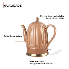 Distribuído por feheros shop Chaleira elétrica porcelana elegance salmão 1,5l base 360 desligamento automático Atenção Esta chaleira elétrica é feita em porcelana, material mais delicado e sofisticado que o inox ou o plástico. Portanto, embora elegante, requer mais cuidado durante o manuseio. Nunca utilize diretamente no fogão ou forno. Produto exclusivo para uso com a base elétrica que acompanha. A chaleira possui desligamento automático ao atingir o ponto de fervura, evitando superaquecimento, mas deve ser sempre Utilizado com água no interior, respeitando o nível mínimo e máximo indicado. Evite quedas, choques térmicos ou batidas. - leia atentamente a descrição e siga o passo a passo que o fabricante recomenda. Informações do produto A chaleira elétrica porcelana elegance salmão vai transformar sua rotina com elegância e eficiência com design clássico e acabamento em porcelana na sofisticada cor salmão, ela une praticidade, charme e segurança para aquecer água de forma rápida. Ideal para quem aprecia bebidas quentes com estilo, como chás, cafés e infusões, ou precisa de água quente com agilidade no dia a dia. A capacidade de 1,5 litros é perfeita para atender toda a família. Conta com base giratória 360, desligamento automático e proteção contra superaquecimento, tornando seu uso seguro e cômodo. É uma peça que além de funcional, valoriza a decoração da sua cozinha. Especificações técnicas - capacidade de 1,5l, ideal para preparo de bebidas ou uso culinário no dia a dia - fabricada em porcelana de alta qualidade, resistente ao calor e com acabamento brilhante e elegante - bico antigotejamento, que evita derramamentos e facilita o uso com mais segurança - base giratória 360 removível, proporcionando mais praticidade para destros e canhotos - desligamento automático ao atingir a fervura da água, evitando riscos de superaquecimento - botão liga/desliga com luz indicadora de funcionamento - design decorativo em porcelana salmão, elegante e funcional - mais eficiente que o micro-ondas e mais segura que as chaleiras de fogão Ficha técnica do produto - capacidade: 1,5 litros - altura com base: 27 cm - largura: 27 cm com alça - diâmetro da base: 16,5 cm - peso: 0,950 kg - material da chaleira: porcelana - material da base: polipropileno com componentes elétricos - frequência: 60 hz - cabo: 80 cm - cor: salmão - desligamento automático - base giratória 360 Antes e depois do primeiro uso - antes de utilizar, verifique se a voltagem da chaleira é compatível com sua tomada. Para a primeira utilização, ferva água uma vez e descarte o conteúdo, eliminando possíveis resíduos de fábrica. Se necessário, repita o processo. - após o uso, aguarde a chaleira esfriar totalmente antes de lavar. Faça a limpeza com esponja macia e sabão neutro. Evite molhar a base elétrica ou utilizar produtos abrasivos. Itens inclusos no pacote - 01 chaleira elétrica de porcelana elegance salmão 1,5 litros - 01 base elétrica com rotação 360 - 01 manual de instruções Todas as fotos são reais dos produtos. Qualquer dúvida, estamos à sua disposição Dúvidas frequentes 01 - a chaleira é 100% de porcelana R: sim. O corpo da chaleira é feito inteiramente em porcelana de alta qualidade, com visual refinado. 02 - pode ser Utilizado no fogão ou micro-ondas R: não. O uso deve ser feito exclusivamente com a base elétrica que acompanha o produto. Não utilize em fogo direto, forno ou micro-ondas. 04 - como acompanhar o envio do produto R: após a postagem, você poderá acompanhar todas as etapas da entrega por meio do código de rastreamento disponibilizado na sua conta.