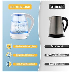 Desfrute de água saudável em minutos com a chaleira elétrica Pukomc, que combina vidro de alta qualidade e aço inoxidável. Feita com vidro de borossilicato, garante a água mais segura e fresca. Com a tecnologia de aquecimento 360 Surround Heat, ferve rapidamente, fornecendo água para toda a sua família em apenas 7 minutos. Atualize para a chaleira elétrica Pukomc e experimente uma vida mais fácil e segura. Com um amplo bocal de 120, oferece facilidade no enchimento e limpeza. Com a função de desligamento automático e proteção contra ebulição a seco, elimina qualquer bagunça ou preocupação com segurança.