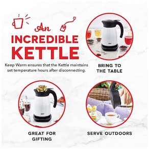 Chaleira elétrica sem fio com controle preciso de temperatura (104-212°F), exterior "Cool Touch" para segurança, capacidade de 1.7L (57 oz), tampa anti-derramamento e base giratória.Acessórios