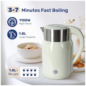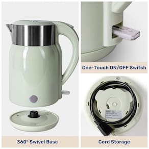 Chaleira elétrica sem fio com capacidade de 1,8 litro, potência de 1100W, base giratória 360°, corpo em aço inoxidável e polipropileno livre de BPA, desligamento automático e proteção contra fervura a seco.Acessórios