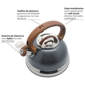 Com 2,7L de capacidade, a chaleira é perfeita para o uso no dia a dia, é feita em aço inoxidável, material que não possui porosidade e por conta disso não acumula cheiro e resíduos, possui revestimento externo na cor granito dando um charme a mais em suas reuniões com amigos e familiares.