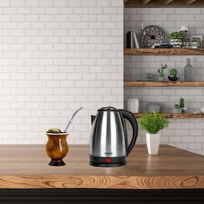Chaleira elétrica de inox 2L, 1000W, base giratória 360°, desligamento automático, proteção contra funcionamento a seco, alça emborrachada e LED indicador.Características