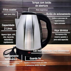 Base giratória 360° sem fio - Desligamento automático ao atingir a fervura - Proteção contra funcionamento a seco - LED indicador - Alça emborrachada .Características
