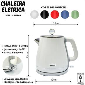 A Chaleira Elétrica Best está disponível nas cores preta, branca, vermelha, verde e azul, permitindo que você escolha a que mais combina com a sua cozinha.
