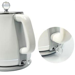 A chaleira é feita de plástico de alta resistência com detalhes em aço inoxidável, garantindo durabilidade e estilo.
