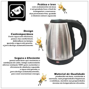 Chaleira Jarra Eletrica Desligamento Automático 1,8 litros Fácil Abertura Tampa Alça Ergométrica 220v Aço inox 1150w Apresentamos a Chaleira Jarra Elétrica com Desligamento Automático, uma adição moderna e prática à sua cozinha. Com uma capacidade generosa de 1,8 litros, esta jarra elétrica é ideal para preparar uma variedade de bebidas quentes de forma rápida e eficiente. A tecnologia de desligamento automático garante segurança e economia de energia, interrompendo automaticamente o processo de aquecimento assim que a água atinge a temperatura desejada. Sua tampa de fácil abertura simplifica o processo de enchimento, facilitando o uso no dia a dia. Construída com materiais de alta qualidade, a jarra é feita de aço inox resistente, proporcionando durabilidade. A alça ergonômica torna o manuseio confortável e seguro, permitindo que você sirva suas bebidas quentes com facilidade. Com uma potência de 1150W, esta chaleira jarra elétrica oferece desempenho rápido e eficaz para atender às suas necessidades diárias. Além de sua funcionalidade prática, esta chaleira jarra elétrica é projetada com um design elegante que complementará a estética da sua cozinha. Seja para preparar chá, café ou outras bebidas quentes, a Chaleira Jarra Elétrica com Desligamento Automático é a escolha perfeita para quem busca conveniência e estilo na hora de aquecer a água. Adquira a sua hoje e desfrute de uma experiência de preparo de bebidas mais eficiente e agradável. Marca: Mimo Importação E Exportação S.A