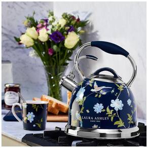 A chaleira de fogão Laura Ashley Elveden Navy é fabricada em aço inoxidável de grau alimentar, com capacidade de 2,5 L, adequada para aquecimento de água em fogões a gás, elétricos, vitrocerâmicos, indução e outros tipos de cooktop compatíveis. A base encapsulada com cinco camadas foi projetada para condução térmica eficiente, favorecendo aquecimento uniforme e redução do tempo de fervura.?
