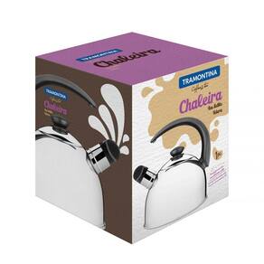 Chaleira Tramontina com Apito em Aço Inox Cabo Preto 2,1 L Feita de aço inox, por isso não solta nenhum resíduo nos alimentos, mantendo-os saudáveis. Altamente durável, mantém as características originais, preservando a beleza, a higiene e a durabilidade do material. Acabamento em alto brilho, valorizando o produto. Para uso doméstico. Com apito, avisa na hora em que a água estiver fervendo; o sistema de apito é acionado por meio do vapor no momento em que a água inicia a fervura na chaleira. Possui cabo de material especial, que não deixa o calor passar. Tampa com encaixe especial, que não deixa vazar e cair na hora de servir.Pode ser utilizada nos fogões: gás, elétrico e vitrocerâmico. Recomendações de uso Para o bom funcionamento do apito, encha a chaleira somente até o início do bico. Para servir, remova o apito. Na tampa da sua nova chaleira existe uma pequena flecha estampada. Para evitar que a tampa caia, alinhe a seta com a parte traseira do cabo antes de servir. Centralize bem a chaleira sobre a chama para evitar que os componentes sejam danificados. Para manter sua peça bonita recomenda-se lavar somente com detergente e esponja. Depois da lavagem, sempre que possível, enxágue o produto com água quente e seque-o imediatamente, para que se mantenha com o brilho original, pois o cloro e as substâncias contidas na água podem deixar manchas. Usando a máquina de lavar, recomendamos retirá-la logo que tenha terminado o ciclo ''enxaguar'', a fim de que a mesma seja secada manualmente.