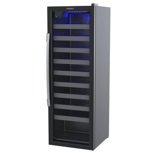 A capacidade de armazenamento da Champanheira 200 da Venax é de até 50 garrafas, com um amplo espaço interno de 209 litros.