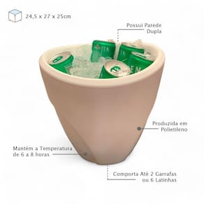 Mais do que isso, tem capacidade para acomodar confortavelmente 2 garrafas ou 6 latinhas. Ideal para uso em buffets, eventos corporativos, festas de casamento e aniversários, na praia, e também para receber e servir amigos em casa. Perfeita para refrigerar diversos tipos de bebidas, como cerveja, espumantes e destilados.