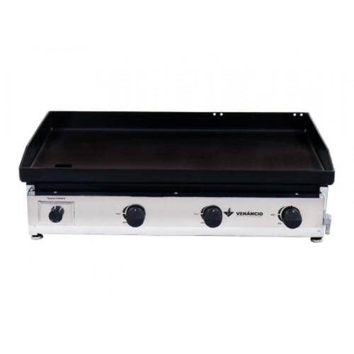 Chapa superior em aço carbono com espessura de 1/4" (6,35mm); Modelo a Gás GLP baixa pressão; Queimadores bem distribuídos com sistema de gaveta posicionado abaixo da chapa; Controle individual dos queimadores; Manutenção simples e barata; Corpo externo em aco inox 430; Pés com regulagem de altura;