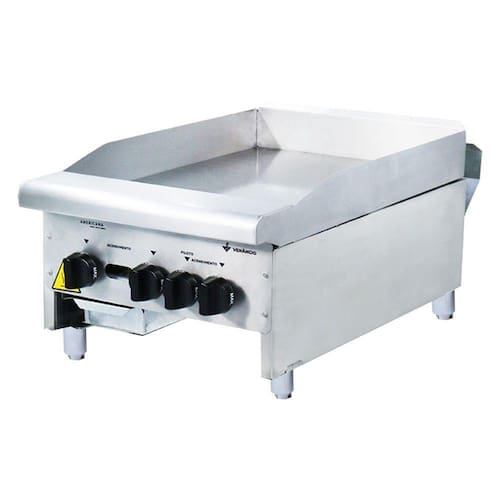 A Chapa Americana a Gás GLP Baixa Pressão é fabricada em aço inox escovado com chapa em aço laminado a quente com espessura de 8mm. Essa Chapa CG45 conta com queimadores esmaltados, controle individual dos queimadores e fácil acendimento através de chama piloto ao lado de cada queimador, contando também com registro independente para chama-piloto e pés em aço carbono cromado com regulagem de altura.