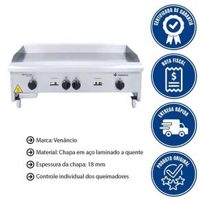 - Transforme o seu negócio com a Chapa Americana Venâncio CG90! Com 90cm de largura e espessura de 18mm, ela oferece uma superfície robusta para preparar alimentos com rapidez e eficiência.