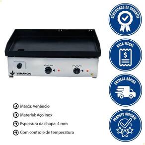 - Fabricada em aço inox, com aquecimento elétrico e controle de temperatura, ela garante preparo rápido e uniforme de carnes, hambúrgueres, ovos, legumes e muito mais.