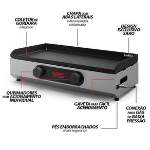 Detalhes do produto: - É de responsabilidade do montador seguir as instruções do Manual de Montagem, que são fundamentais para garantir a estrutura do móvel; - Produto enviado desmontado, a montagem é simples e pode ser realizada facilmente com a ajuda do manual de montagem; - Garantia de 12 meses contra defeitos de fabricação; - Chapa com abas laterais que evitam respingos na bancada; - Baixo consumo de gás e muito menos sujeira (e de fácil limpeza); - Gaveta coletora de resíduos e gordura; - Pés emborrachados, estrutura não fica encostada no chão diretamente; - Design exclusivo SARO; - Gaveta para fácil acendimento; - Dois queimadores com acionamento individual.