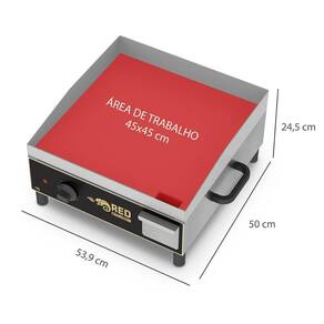 Uma chapa para lanches super compacta com uma área de trabalho de 45 x 45 cm, excelente para ter na sua casa ou negócio, prepare hambúrgueres e grelhados incríveis com aquele sabor que só uma chapa dá. Fácil e prático de limpar, os seus grelhados ficam prontos em pouco tempo. Para conservar a sua chapa também é super fácil, após a limpeza, deixe secar e passe na chapa algum tipo de gordura próprio para a alimentação, cobrindo com um plástico filme.