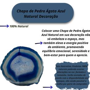 Decoração sofisticada: Perfeita para quem aprecia peças de decoração com um toque natural e exclusivo, ideal para ambientes modernos e contemporâneos. Propriedades calmantes: A Ágata Azul é conhecida por suas propriedades relaxantes e equilibrantes, proporcionando um ambiente mais sereno e harmonioso. Peça única: Cada chapa tem padrões únicos, garantindo que sua decoração tenha um item exclusivo e cheio de personalidade.