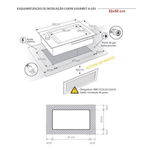 A chapa gourmet atinge temperaturas elevadas, e portanto não deve ser instalada sobre ou próxima de materiais inflamáveis e sensíveis ao calor, como eletrônicos, MDF, MDP, madeiras, laminados, tecidos, couro, plásticos e materiais sintéticos. A instalação deve ser feita em nicho previamente preparado na bancada de pedra (Mármore, Granito, Quartzo, Venato, entre outras), que deve ser cortada com os cantos arredondados para evitar pontos de fragilidade. Além disso, a chapa a gás necessita de um nicho com altura mínima de 40 cm e ventilação para a circulação de gases.
