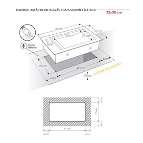 A chapa gourmet atinge temperaturas elevadas, e portanto não deve ser instalada sobre ou próxima de materiais inflamáveis e sensíveis ao calor, como eletrônicos, MDF, MDP, madeiras, laminados, tecidos, couro, plásticos e materiais sintéticos. A instalação deve ser feita em nicho previamente preparado na bancada de pedra (Mármore, Granito, Quartzo, Venato, entre outras), que deve ser cortada com os cantos arredondados para evitar pontos de fragilidade.