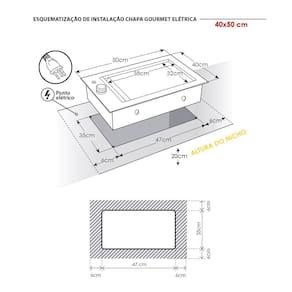 A chapa gourmet atinge temperaturas elevadas, e portanto não deve ser instalada sobre ou próxima de materiais inflamáveis e sensíveis ao calor, como eletrônicos, MDF, MDP, madeiras, laminados, tecidos, couro, plásticos e materiais sintéticos. A instalação deve ser feita em nicho previamente preparado na bancada de pedra (Mármore, Granito, Quartzo, Venato, entre outras), que deve ser cortada com os cantos arredondados para evitar pontos de fragilidade.