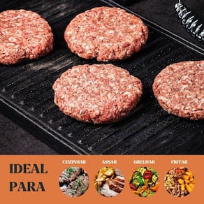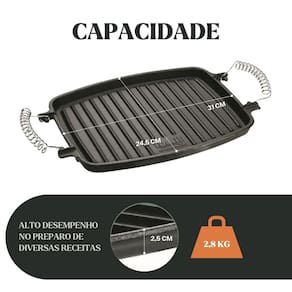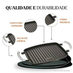 Modelo: Chapa Grill Retangular Alça Espiral 31x24,5x5,5cm Material da peça: ferro fundido Material da alça: ferro espiral Medidas: 31 × 24,5 × 5,5 cm Peso aproximado: 2,82 kg Compatível com fogão: indução, gás, elétrico, vitrocerâmico, lenha, forno Já vai curada. Pronta para uso Revestimento atóxico camada protetora Garantia: 90 dias contra defeitos de fabricação A Chapa Grill Retangular Panela Mineira foi criada para grelhar carnes, legumes, peixes e hambúrgueres com marcas tradicionais e sabor acentuado. O ferro fundido puro garante aquecimento uniforme e desempenho superior, enquanto a alça espiral oferece resistência térmica e praticidade no manuseio. Robusta, eficiente e feita para durar, é perfeita para cozinhas de alto fluxo. Ideal para bares, hotéis, pousadas, restaurantes, buffets e também para uso diário em casa. CONTEÚDO DA EMBALAGEM 1x Chapa Grill Retangular Alça Espiral 31x24,5x5,5cm CUIDADOS APÓS O USO Lave com água e sabão neutro Seque ao fogo Aplique óleo fino Guarde em local seco e arejado CURA DO PRODUTO Lave e remova oxidação se houver Seque ao fogo Aplique óleo em toda a peça Aqueça por 15 minutos Repita se necessário IMAGENS MERAMENTE ILUSTRATIVAS