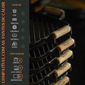 Chapa grill fabricada em ferro fundido, indicada para o preparo de carnes, legumes e peixes. O material contribui para aquecimento uniforme e boa retenção térmica durante o preparo. As alças em madeira naval auxiliam no manuseio e na apresentação à mesa.