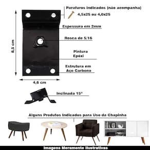 Produtos indicados para fixação da Chapinha:Puff, Aparador, Banco, Poltrona, Sofá, Mesa de centro e Lateral, Home, Rack, Cama Box