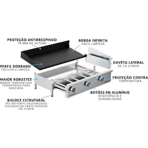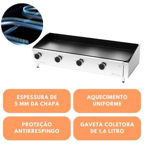 Fabricadas em aço inox escovado, elas possuem botões reguláveis em alumínio da vazão de gás, gaveta coletora de óleo na lateral e queimadores em alumínio que não enferrujam e borda antirrespindo de 7,4 cm de altura.