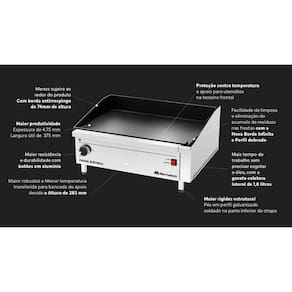 Resistências elétricas de alta performance garantem distribuição homogênea de calor, assegurando o ponto ideal em toda a superfície;