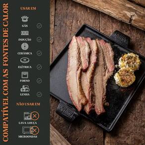 Chapa petisco quadrada fabricada em ferro fundido, indicada para preparo e serviço de carnes, legumes, queijos e porções. Possui alça em ferro para apoio no manuseio. Produto indicado para uso doméstico e profissional.