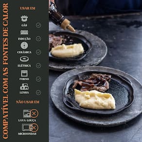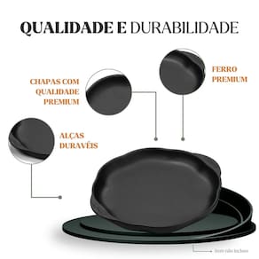 Chapa fabricada em ferro fundido, indicada para o preparo e serviço de carnes, legumes, queijos e diversos tipos de petiscos. O material proporciona aquecimento uniforme e excelente retenção de calor, mantendo os alimentos aquecidos por mais tempo durante o uso e o serviço à mesa.