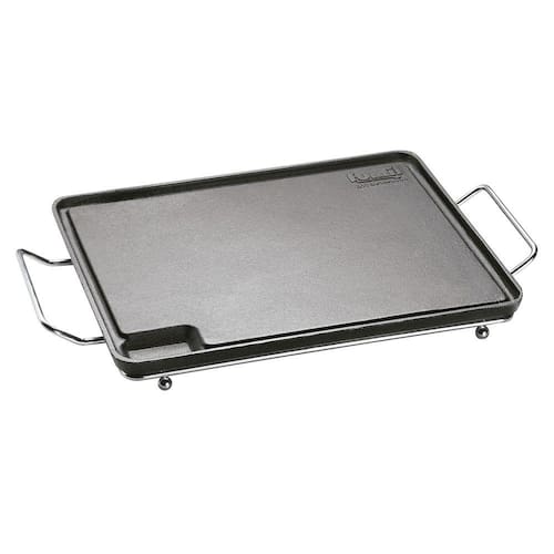 Chapa de ferro petisco, retangular. Medida: 28 x 23 cm. Acompanha suporte de aço cromado para levar a mesa. O suporte em aço substitui muito bem o suporte em madeira utilizado para servir porções, pois além de atender as exigências da vigilância sanitária o suporte em aço não queima a mesa e é muito mais resistente. Muito utilizada por bares e restaurantes para servir porções devido a sua resistência, boa apresentação e por manter-se quente por muito tempo.