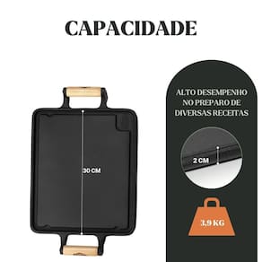 Loja Oficial Panela Mineira®Modelo: Chapa Lisa Retangular 30x25x5cmMaterial: Ferro fundidoMedidas: 30 × 25 × 5 cm (C × L × A)Peso: 3,22 kgDiferenciais: Alça em madeira naval de reflorestamentoCompatível com fogão: Indução, gás, elétrico, vitrocerâmico, lenha, forno e churrasqueiraJá vai curada. Pronta para usoCamada protetora: AtóxicaGarantia: 90 dias contra defeitos de fabricaçãoRemova a alça de madeira antes de levar ao forno