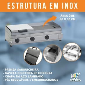 Equipamento de alta performance já que a chapa de aço mantém a temperatura ideal para a preparação de lanches e outros alimentos. Utiliza gás de botijão doméstico (baixa pressão) e os queimadores em alumínio de longa durabilidade.