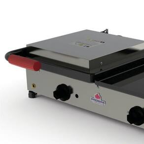 Chapa reforçada para frituras e sanduiches. Produto reforçado. Aquecimento através de resistência elétrica inferior e superior controladas por termostato.