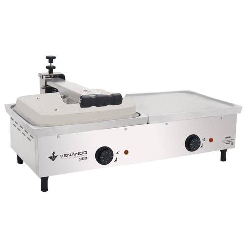 A Chapa Conjugada é fabrica em alumínio fundido com corpo e painel em aço inox 430, garantindo o aquecimento uniforme da chapa e fácil limpeza do produto. Conta com punho resistente ao calor sendo equipada com 3 resistências elétricas, prensa lisa e escorredor de resíduos na peça com coletor em aço inoxidável encaixado ao corpo.