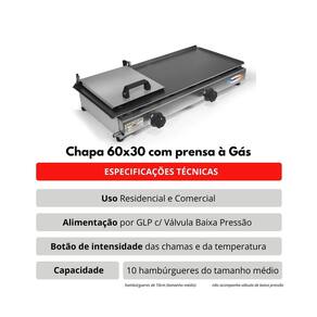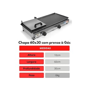 Chapeira Industrial com prensa à Gás 60x30cm PraticSe você quer preparar lanches com rapidez, economia e praticidade, essa chapeira a gás com prensa é ideal pra sua casa ou pequeno comércio. Compacta e eficiente, ela tem espaço de sobra pra grelhar hambúrgueres, calabresas, bifes e muito mais com ótimo rendimento. Com 60 cm de largura, essa chapa suporta até 10 hambúrgueres médios (10cm) por vez. Possui 2 queimadores bem distribuídos, que garantem um aquecimento uniforme mesmo usando só um lado. A prensa com cabo fácil de manusear agiliza o preparo, deixando os lanches no ponto certo. A estrutura é feita em chapa metálica reforçada e tem base emborrachada pra mais segurança no uso. O acendimento é manual com sistema de gaveta, que evita vazamentos e dá mais controle. A gaveta aparadora de resíduos facilita a limpeza, e o botão ajustador permite regular a chama em 5 níveis diferentes. Dimensões: 60 cm (largura) x 30 cm (profundidade) x 10 cm (altura) Peso: 6 kg Acompanha válvula ou mangueira? Não. Usa gás GLP com válvula de baixa pressão (como fogão comum). É antiaderente? Não, mas é fácil de limpar com pano úmido e a gaveta de resíduos. Dá pra usar só um lado? Sim, os queimadores são independentes. É fácil de usar? Sim. É só conectar, acender com fósforo e ajustar a chama. Cabe quantos hambúrgueres? Até 10 hambúrgueres de 10 cm por vez. Garantia3 Meses contra Defeito de Fabricação