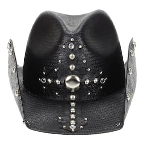 Chapéu Pralana modelo exclusivo João Carreiro & Capataz, fabricado com fibras de celulose no estilo palha cor Preta, aba de 9cm, copa de 10cm, detalhes em rebites de metal, cruz em recouro na copa com strass e rebites e carneira de elástico.