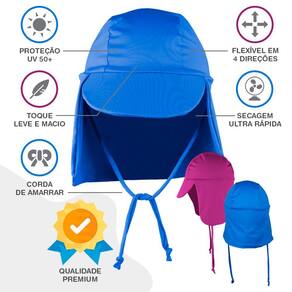 TAMANHOS-Tamanho P (6 meses a 2 anos) - COM cordinha de amarrar;-Tamanho M (2 anos a 6 anos) - COM cordinha de amarrar;-Tamanho G (7 anos a 14 anos) - COM cordinha de amarrar.Confeccionados com tecido muito flexível e confortável, com proteção solar UV 50+, com ergonomia pensada para servir perfeitamente em cabeças infantis e até de adultos (tamanho G), testados e aprovados!Uma das maiores preocupações dos pais, quando levam seus filhos em atividades ao ar livre, são as queimaduras de sol! Com o nosso lindo boné/ chapéu infantil UV 50+, esse problema acabou! Pois ele protege o rosto, as orelhas e a nuca dos pequenos, até embaixo d'água, com muito conforto, deixando os cuidadores despreocupados!Afinal, o que significa Proteção Solar UV50+?UV é a sigla para ultravioleta e 50 +, significa que que 98% dos raios solares são bloqueados, protegendo toda a área de cobertura da cabeça, rosto, orelhas, pescoço e nuca da criança.Tecido com proteção solar UV 50 + PREMIUM, antibacteriano e com Aloe Vera. Proporcionando conforto para os pequenos.Composição do tecido:Malha 90% Poliamida e 10% Elastano (proporcionando elasticidade e um ajuste perfeito para as cabeças infantis). Confeccionado com microfibra de última geração, com toque macio e pigmento, que preserva de forma efetiva, a proteção solar por tempo VITALÍCIO, ou seja, o boné pode ser lavado por infinitas vezes, preservando por todo tempo, a sua finalidade de proteção contra raios solares.Tecido com eficácia comprovada, é submetido a rigorosos testes, realizados por laboratórios credenciados, a fim de comprovar o FPU (fator de proteção ultravioleta).Tratamento Sport Dry com Aloe Vera:Tecnologia inovadora, que permite a absorção do suor, proporcionando um alto frescor à pele sensível das crianças e evitando a proliferação das bactérias causadoras de maus odores.Modo de Lavar:Produto com secagem rápida, deve ser lavado à mão, com sabão neutro e NUNCA com produtos à base de cloro. Não deve ser passado à ferro.
