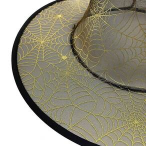Chapéu de Bruxa com Teia - Acessório elegante e temático para fantasias de Halloween. Produzido em tecido leve e translúcido, com acabamento de aranha e teias em detalhes dourados, garantindo um visual sofisticado e chamativo. Ideal para festas, eventos temáticos e apresentações, proporcionando conforto e estilo durante o uso.