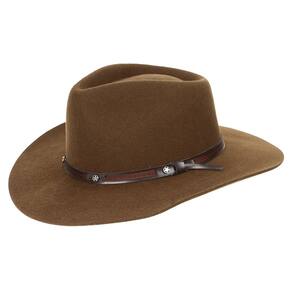 Chapéu Pralana fabricado em feltro 100% lã, cor café, aba de 7cm e copa de 11,5cm, carneira de elástico, banda de recouro com detalhe em fita de nylon e margaridas de metal. Fino acabamento.