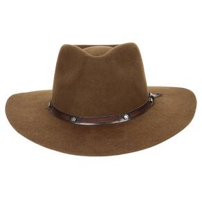 Chapéu Pralana fabricado em feltro 100% lã, cor café, aba de 7cm e copa de 11,5cm, carneira de elástico, banda de recouro com detalhe em fita de nylon e margaridas de metal. Fino acabamento.